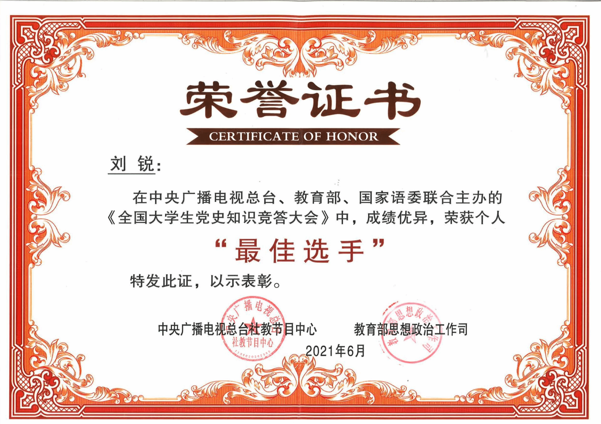 荣获由教育部、中央电视总台联合颁发的《全国大学生党史知识竞答大会》团体“二等奖”,可乐小说网
