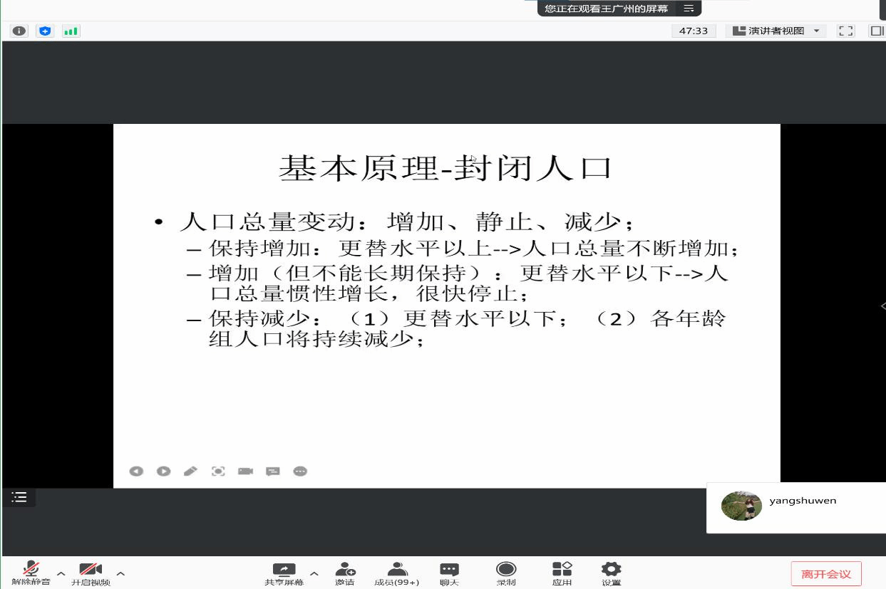 师生开展了腾讯会议线上讲座。会议主题为:从第七次人口普查看中国人口负增长问题。讲座持续90多分钟,校内外100多名师生参与学习。