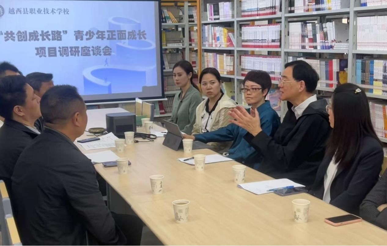 周正副教授所带领的“共创成长路”项目团队共同深入三所项目实施学校,越西县委常委阿七伍甲,县政府党组成员陈丹枫陪同参访。通过实地参访与座谈会的形式,团队详细了解了项目开展效果与现存困难。在越西二中,项目团队针对该校项目实施情况开展座谈,重点考察心理健康课程体系与“共创成长路”项目落地成效,与一线教师研讨教学难点;在普雄民族学校,项目团队围绕民族文化与心理健康教育的融合路径展开调研,实地评估学生心理辅导室使用效能;在越西县职业技术学校,则聚焦职业教育阶段学生的心理特点与成长需求,探索项目与职业素养培育结合的可行方案。