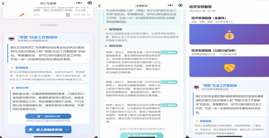 何龙韬教授团队成功自主开发“带路”安宁疗护社会工作智能平台2.0(“宁护带路”微信小程序2.0)、“带路”社会工作智能体、“带路”虚拟心理陪伴师(联合开发)系列。该平台与AI系列基于依托何龙韬教授主持的国家社会科学基金后期重点项目“人口老龄化背景下的临终关怀社会工作研究”(23FSHA002)研发,以何龙韬教授创新提出的整体性循证框架(IEBF)为方法论基础,将既有研究证据、实践经验与干预策略转化为模块化、可操作的社会工作服务智能平台。